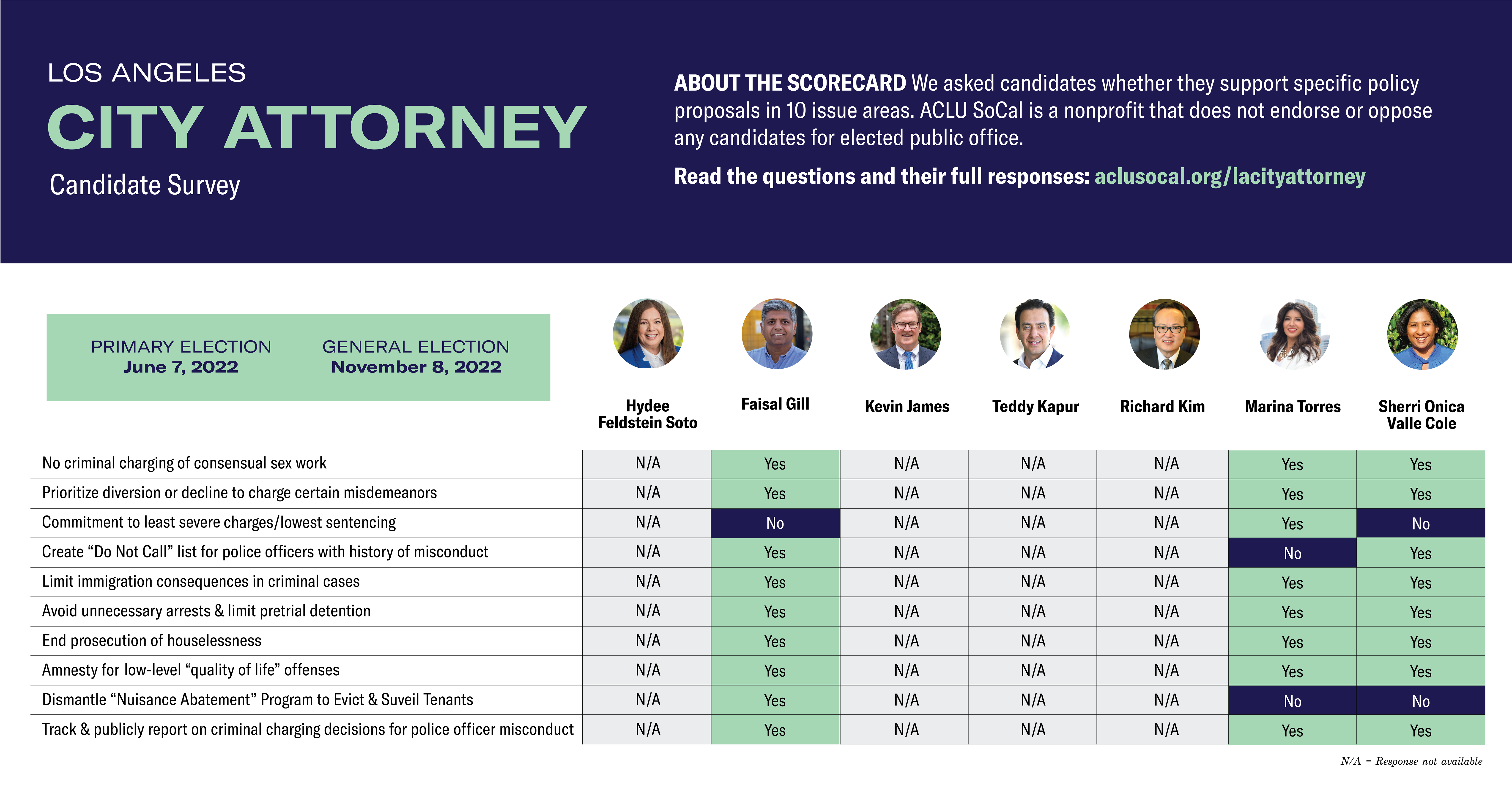 To help the people of Los Angeles elect a city attorney that is an advocate for issues such as criminal justice reforms, alternatives to incarceration, the treatment of unhoused residents, law enforcement accountability, and immigrant rights, we surveyed the primary candidates on a range of social justice measures and asked them to provide statements to explain to voters how they would champion ACLU issues.