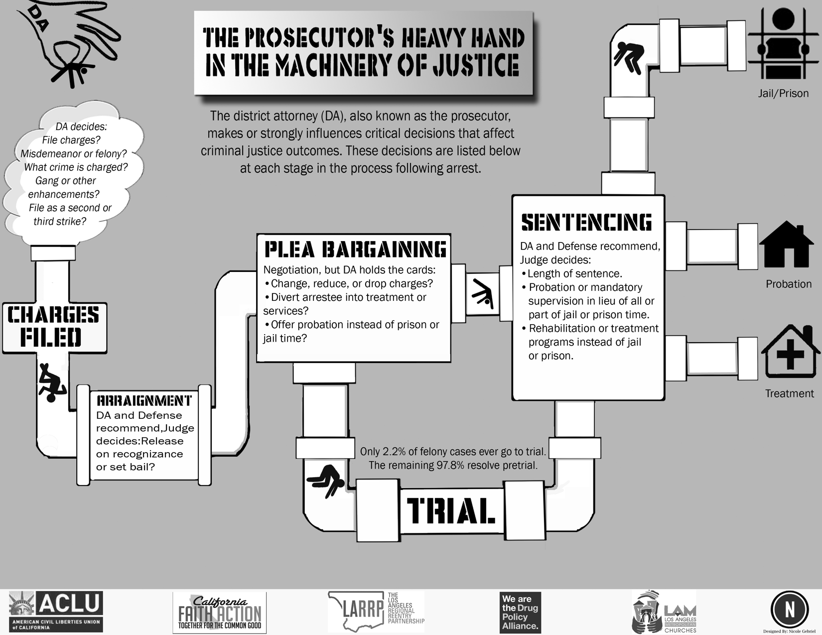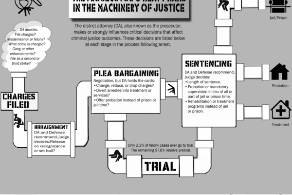infographic demonstrating the many critical decisions a D.A. makes that affect individuals going through the system, and a